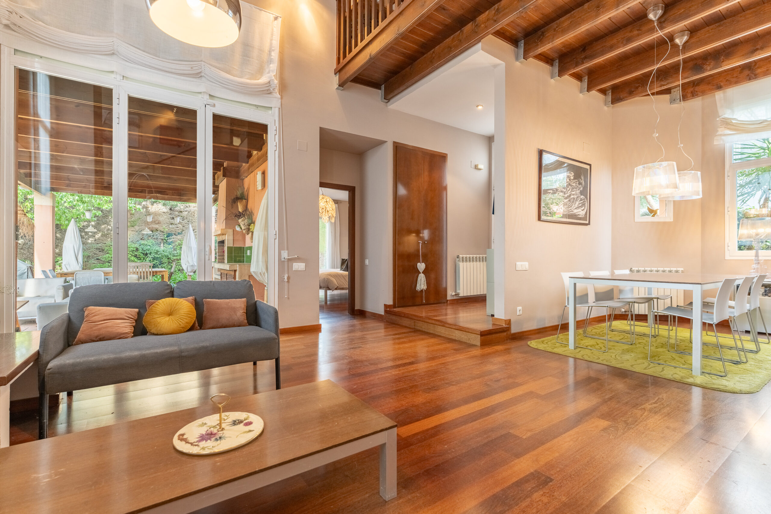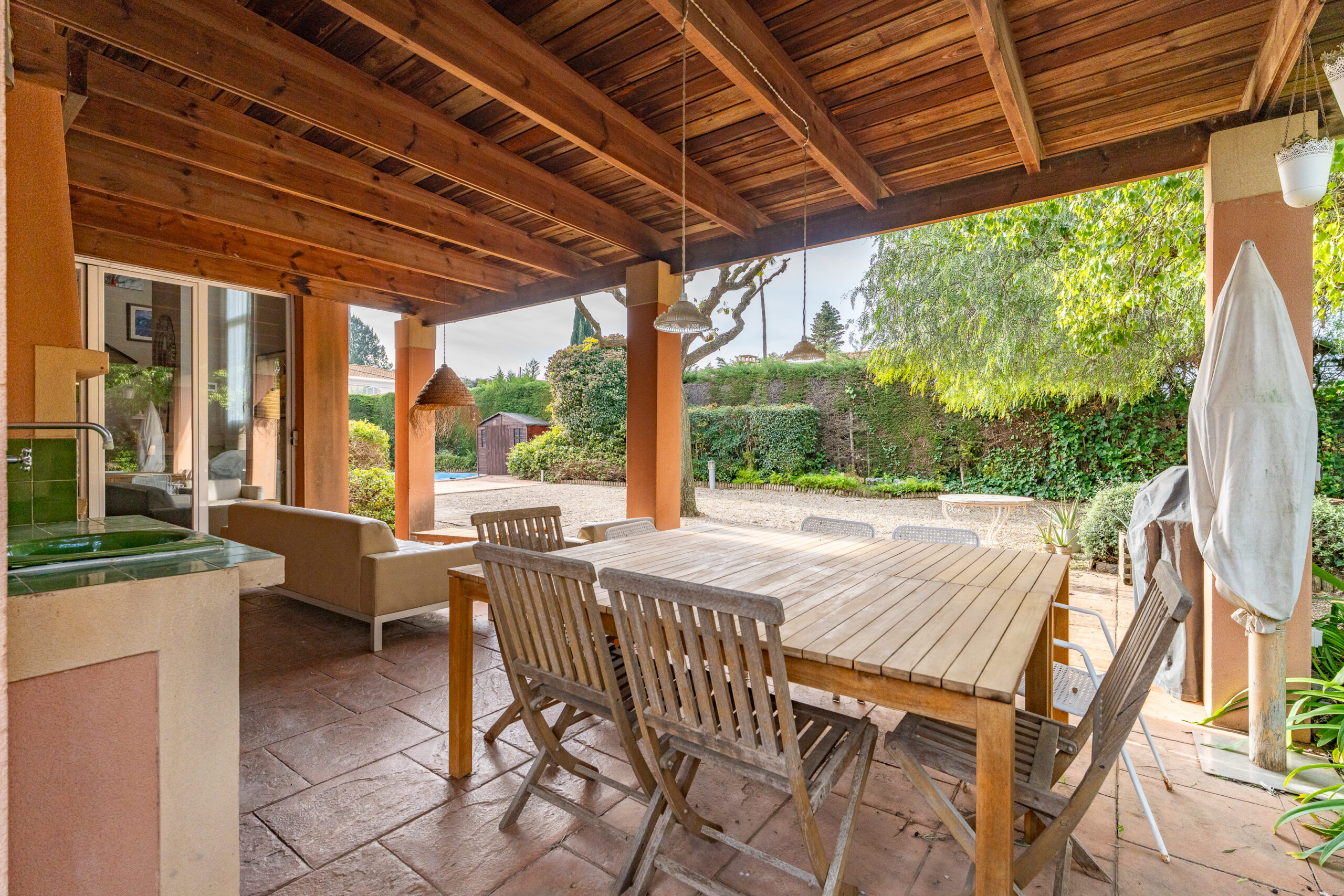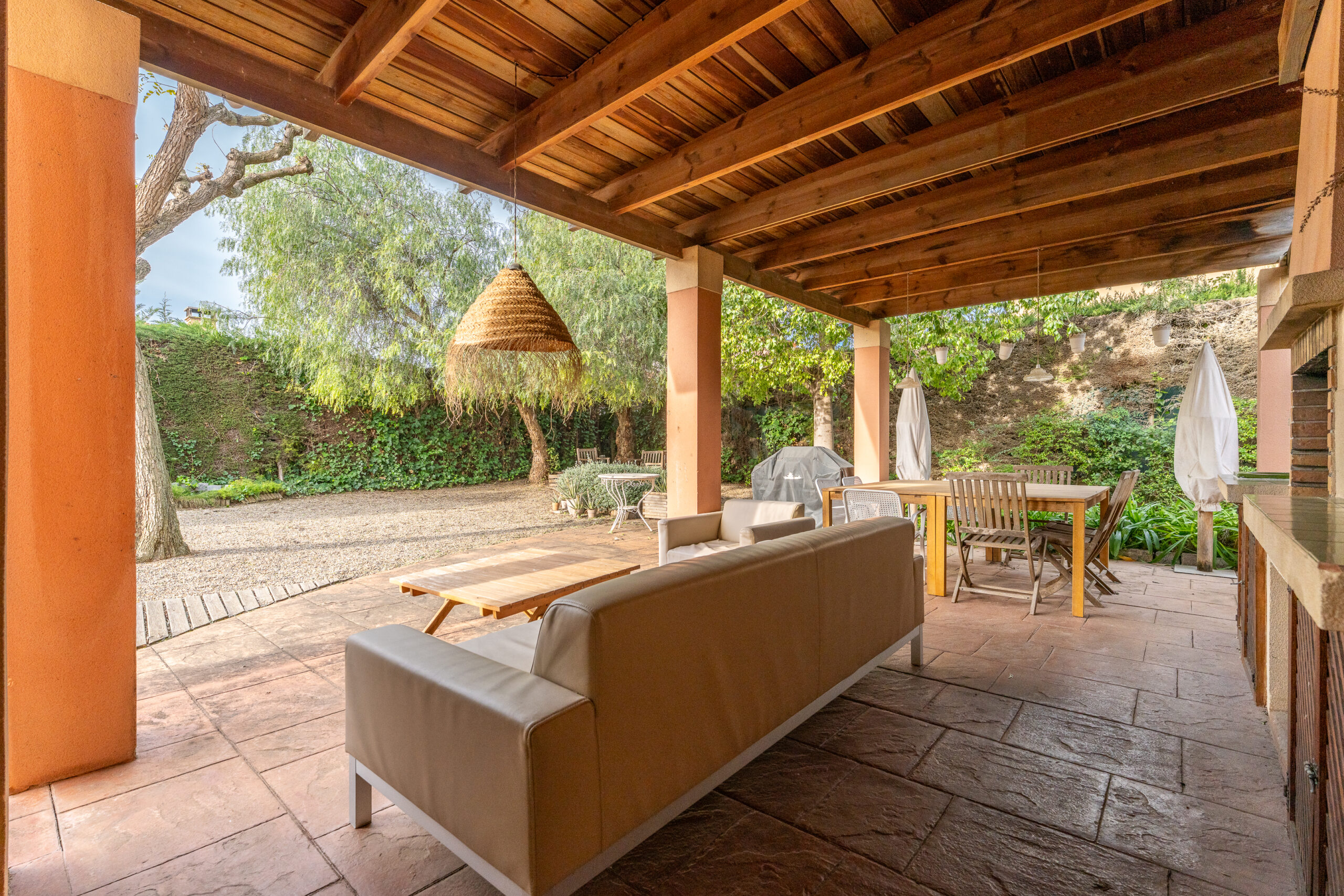 A la planta baixa gran saló menjador, amb sortida al porxo, zona de menjador exterior amb aigüera i barbacoa. Cuina independent amb zona office i rebost, habitació doble amb bany complet amb sortida a l´exterior i un bany de cortesia.