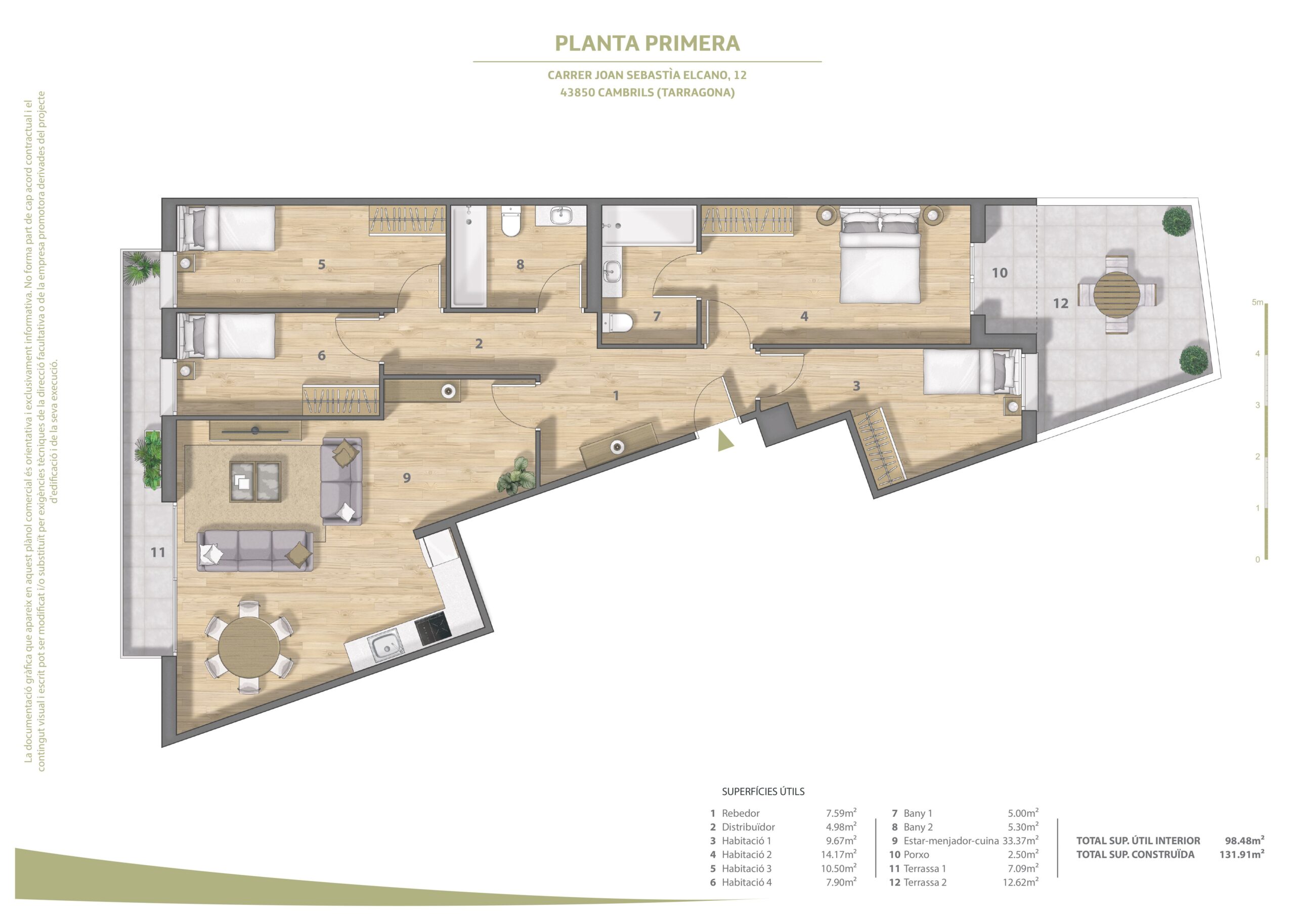 Cada habitatge consta d’una superfície de 131,91m2 construïts, distribuïts em 4 habitacions una d’elles suite amb bany i sortida a una terrassa de 7m2 a la primera planta i 2,50m2 a la segona i tercera, saló menjador molt lluminós amb una cuina oberta i accés a la terrassa de 7m2.